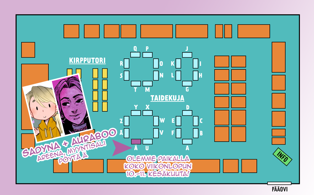 Meidät löytää pöydältä Ä myyntisalista (Areena), taidekujan puolelta. Pöydän sijainti merkattu allaolevaan karttaan suunnistusta helpottamaan. Lisätietoa taidekujan aukioloista, myyjistä ja sijainnista löytyy tapahtuman sivuilta.
