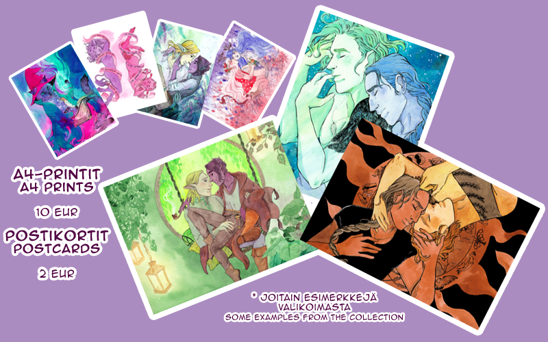 Pöydältämme löytyy myös laaja kattaus printtejä ja postikortteja, erityisesti värikkäässä fantasiameiningissä demonien ja velhojen ryydittämänä. Jos romanttinen fantasia sateenkaarevin teemoin on juttusi, meiltä saattaa hyvinkin olla jotain sinulle.