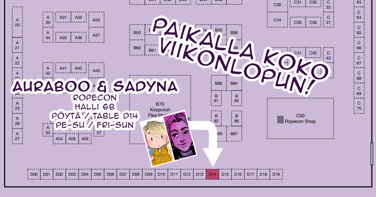 Viime vuoden tapaan Ropecon sijaitsee Helsingin Messukeskuksessa, heti Pasilan juna-aseman kyljessä. Taiteilijatori löytyy myyntisalista (halli 6b) ja meidän pöytämme on numero D14. Sen löydät hallin perältä, ks. oheinen kartta.