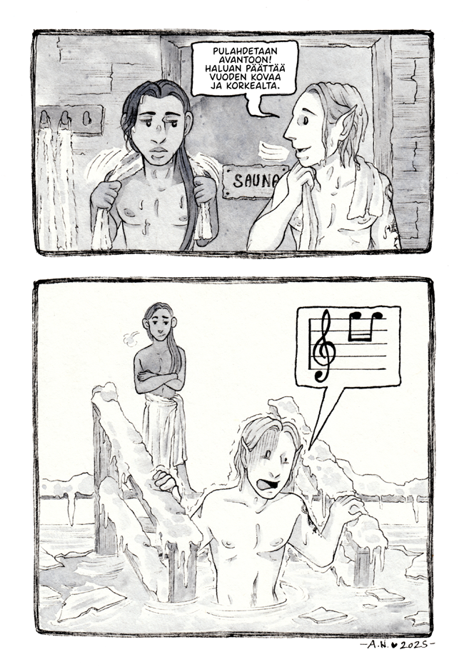 Hyvää uutta vuotta! Tämän inspiraationa oli ihan se puhdas seikka, että kävin vaimon kanssa pulahtamassa avannossa uudenvuodenaattona, joskaan minusta ei irronnut korkealentoisia ääniä tällä kertaa.