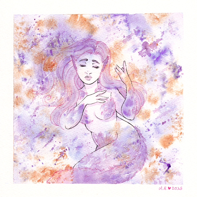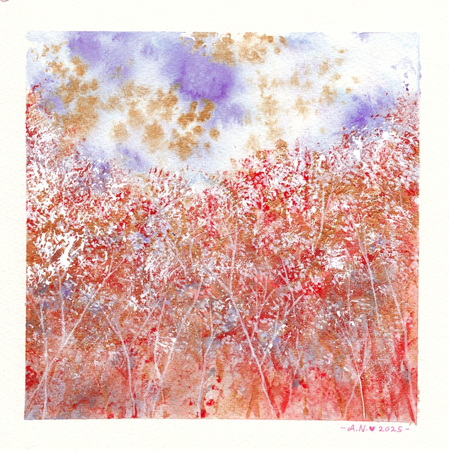 Itse tausta on vesivärilaveeraus: yhdistelmä Kuretake Gansai Tambi -sarjan kultaa ja granuloivien vesivärien sävyjä (jälkimmäisestä sävy taisi olla Aurora Violet). Puolikuivaan laveeraukseen on töpötelty märkään maaliin kastettua muovikelmua – sävyt ovat saman kuin laveerauksessa. Maalin kuivuttua käytin tuttua roisketekniikkaa roiskimalla märällä siveltimellä maalia sinne tänne, kunnes lopputulos miellytti silmää. Vaikka kyseessä on loppujen lopuksi hyvin yksinkertainen työ, on aina hauska nähdä, että pelkillä tekstuureilla voi saada aikaan liikkeen tuntua.